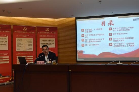 冉龍彬同志從深刻把握黨的二十大的重大意義,深刻把握過去5年的工作和新時代10年的偉大變革,深刻把握譜寫馬克思主義中國化時代化新篇章的歷史責任,深刻把握以中國式現代化推進中華民族偉大復興的使命任務,深刻把握全面建設社會主義現代化國家的目標任務,深刻把握以偉大自我革命引領偉大社會革命的重要要求,深刻把握關于發揚斗爭精神、應對風險挑戰的重要要求,全面學習、全面把握、全面落實黨的二十大精神8個方面,對黨的二十大精神進行了全面系統深入的宣講解讀。