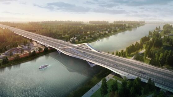 安運橋主橋設計采用梁-拱型組合體系,立意“荷香”,將荷葉形態融入到橋梁造型當中,荷葉浮于運河之上,整個造型宛如運河上盛開的荷花,生態自然,與環境融為一體,給人以生機盎然、自然和諧的美感。
